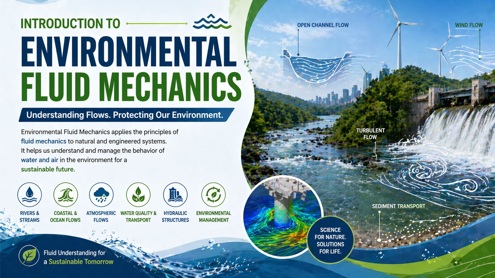 Environmental Fluid Mechanics (EFM) is a specialized field within fluid mechanics that focuses on the study of fluid motion in natural and engineered environmental systems. It applies principles of physics, mathematics, and engineering to analyze the behavior of fluids (liquids and gases) in rivers, lakes, oceans, atmosphere, groundwater, and urban environments. EFM plays a crucial role in understanding and managing environmental processes, such as pollutant transport, sediment erosion and deposition, coastal erosion, and atmospheric dispersion.